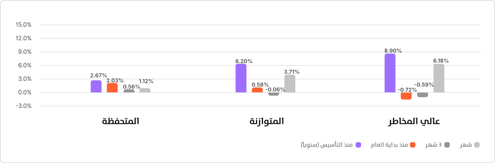 | عالي المخاطر | 6.18% | 0.59%- | 0.72%- | 9.67% | 23.62% | 31.16% | 23.15%- | 10.51% | 35.27% | 8.90% | 16.31% | 0.65% |